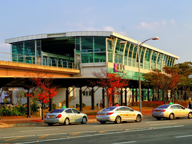 金海空港にはタクシースタンド、そして都市交通の駅がある。都市交通の電車に乗ると釜山地下鉄の駅まで出れる上、安い。